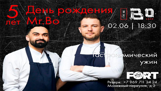 2 июня гастрономически-творческий тандем двух талантливых шеф-поваров, Дмитрия Богачева и Эльдара Мурадова отмечает 5-летие совместного проекта – ресторана современной азиатской кухни Mr.Bo и приглашает гостей на праздничный сет.